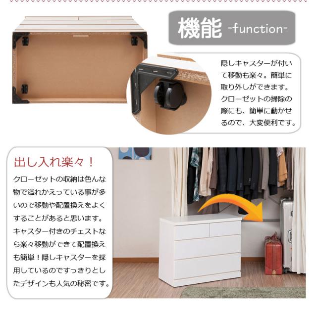 ■商品について/クローゼット下や押入れのデッドスペースの有効活用に大変便利なキャスター付きチェスト。大引出しにはレールが取り付けられており、タップリ収納した引出しの開閉も楽々。、本体はキャスター付きだから、移動も楽々です。
