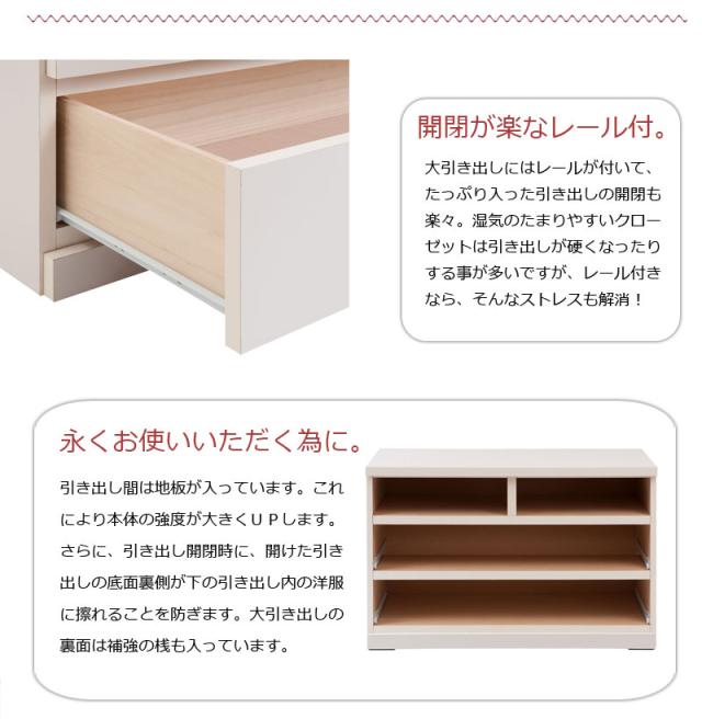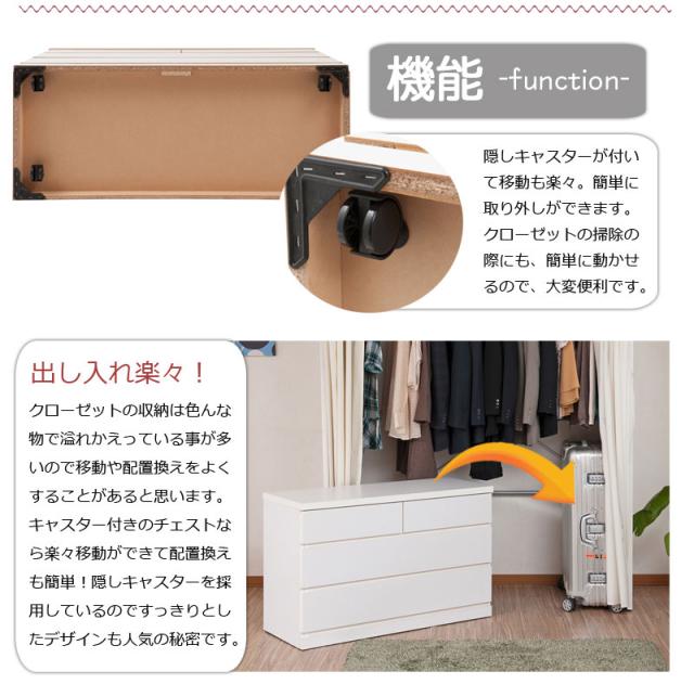 ■商品について/クローゼット下や押入れのデッドスペースの有効活用に大変便利なキャスター付きチェスト。大引出しにはレールが取り付けられており、タップリ収納した引出しの開閉も楽々。、本体はキャスター付きだから、移動も楽々です。