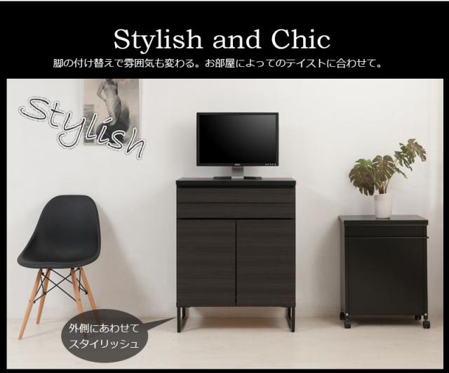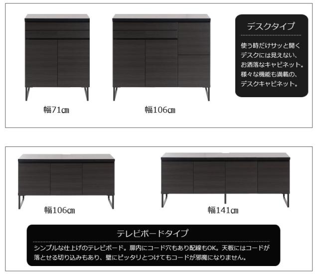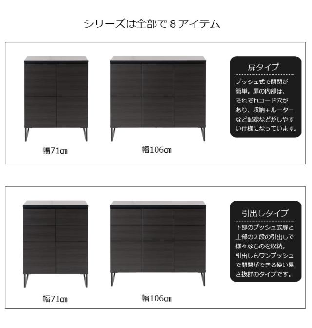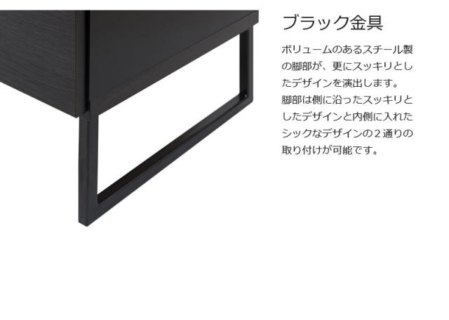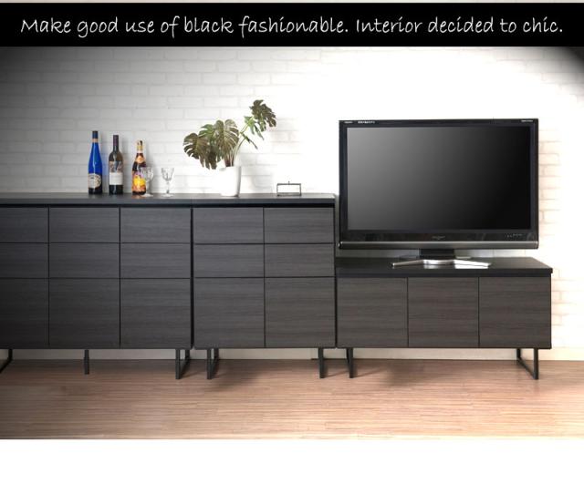 ■商品について/オールブラックで仕上げたキャビネットは風格のある存在感。細脚からスタイリッシュに完成されたスクエア感は直線的で黒木目とマッチ。扉・引出しの構成のキャビネットやローボードに機能的なデスクタイプも加わりリビング空間をカッコよく演出。ソリッドブラックな脚部や細部に木目の効いた表面材が絶妙なバランス。引出しはスライドレール付き