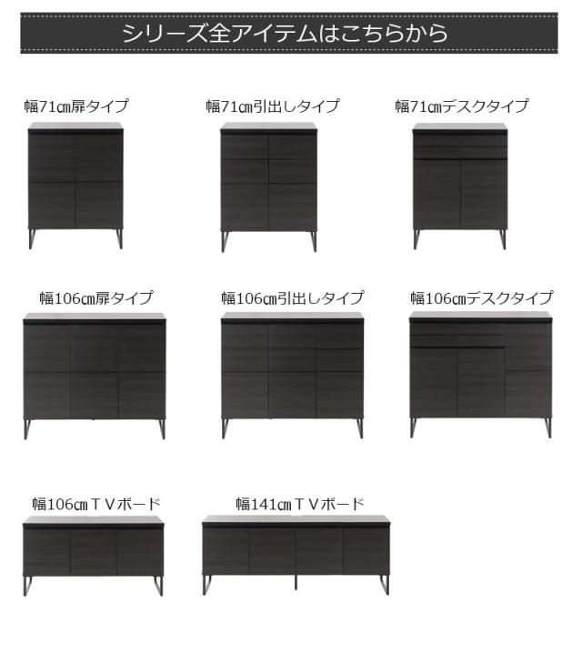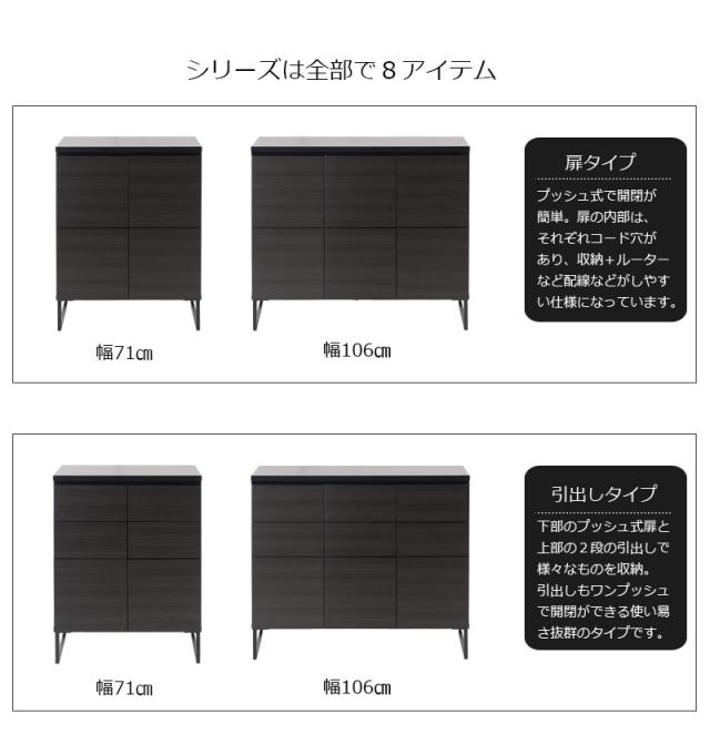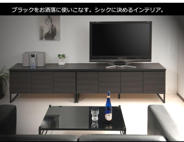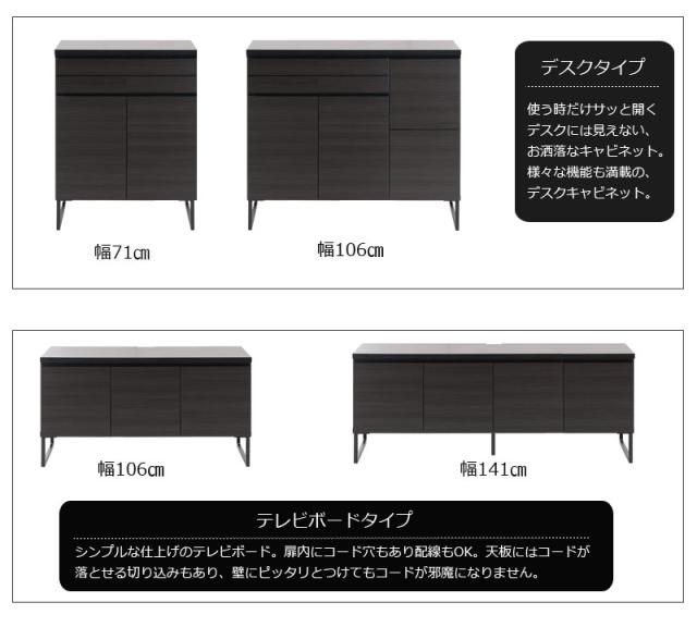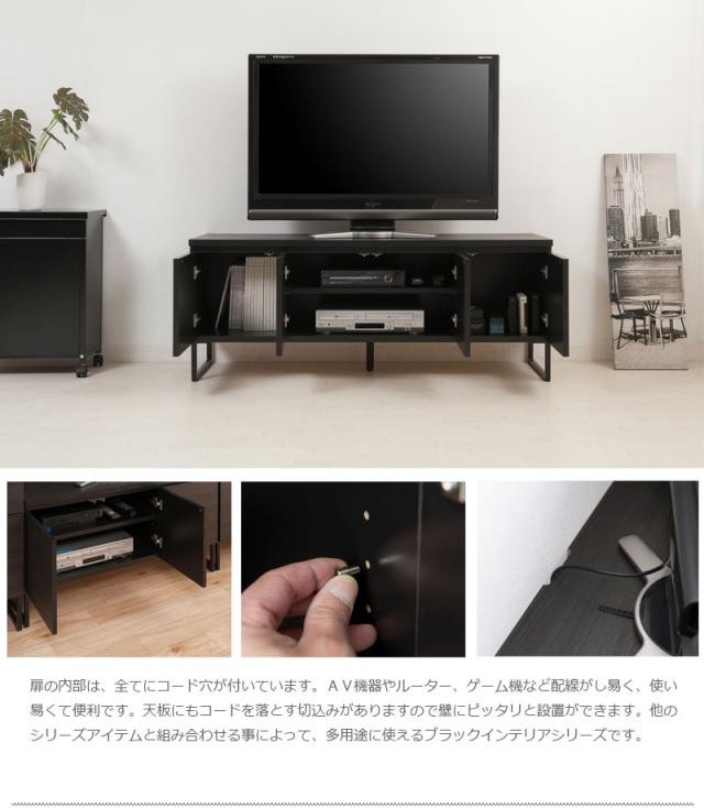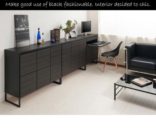■商品について/オールブラックで仕上げたキャビネットは風格のある存在感。細脚からスタイリッシュに完成されたスクエア感は直線的で黒木目とマッチ。扉・引出しの構成のキャビネットやローボードに機能的なデスクタイプも加わりリビング空間をカッコよく演出。ソリッドブラックな脚部や細部に木目の効いた表面材が絶妙なバランス。