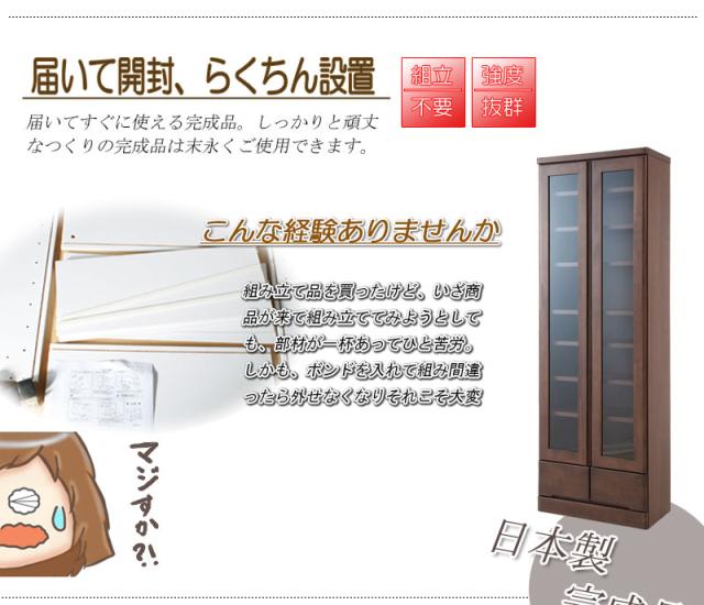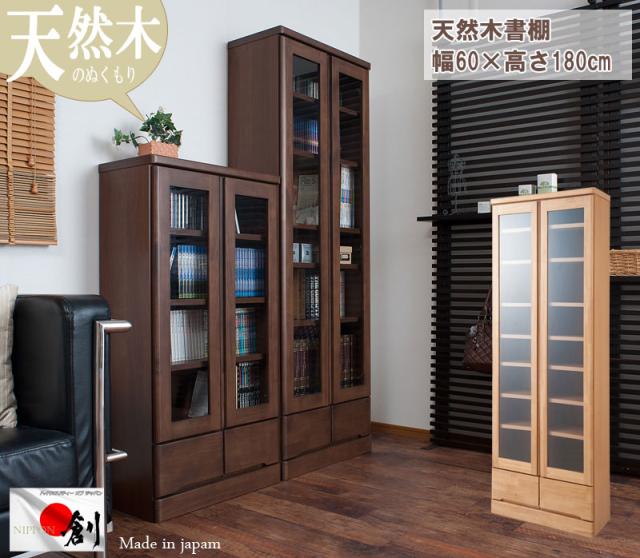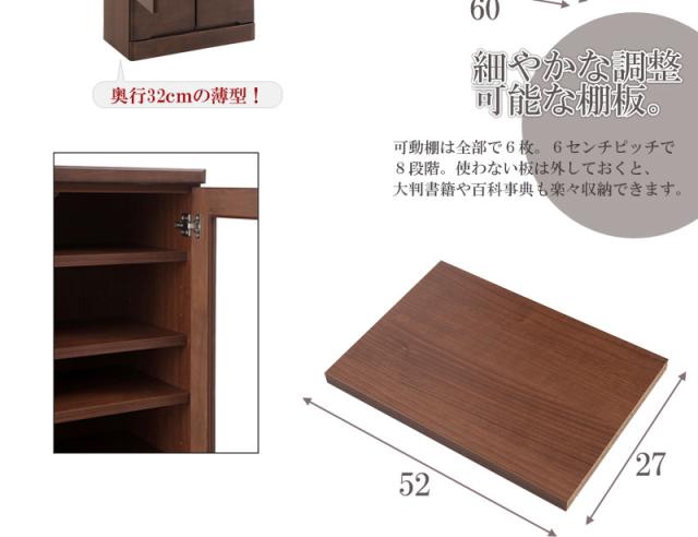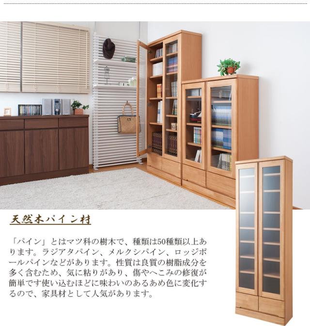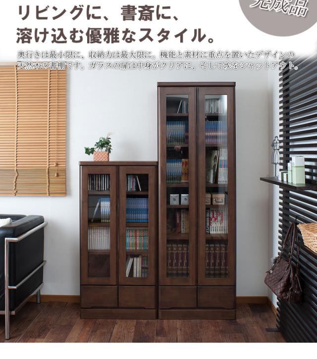 ■商品について/前板全面に天然木をあしらった贅沢な書棚。天然木の良さを細部にまで生かした高級仕上げ。ガラスに映りこむ日差し、ライトなどがより上品に雰囲気を醸し出します。書棚として、本だけでなくフリーボードとして収納&ディスプレイをお楽しみください。スッとお部屋に溶け込むナチュラル色、どっしり重厚感を感じられるブラウン色。前面の両サイドは角を落としたアール付きで人に優しいデザイン。こどもにも安心デザインで設置場所を選びません。奥行32cmの省スペース設計で書棚だけでなくキッチンで食器棚としても活躍します。