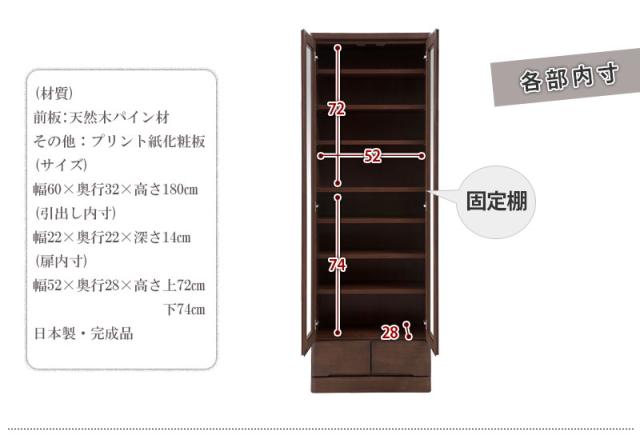 ■商品サイズ/本体:(約)幅60×奥行32×高さ180cm、引出し内寸:(約)幅22×奥行き22×深さ14cm 、扉内寸:(約)幅52×奥行き28×高さ(上)72(下)74cm