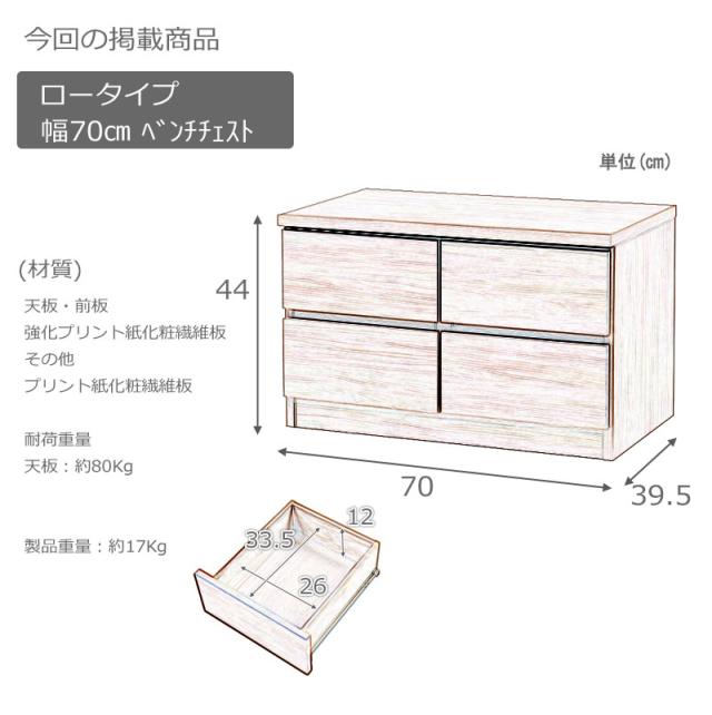 ■商品サイズ/本体:(約)幅70×奥行39.5×高さ44cm、引出有効内寸:(約)幅26×奥行33.5×高さ12cm