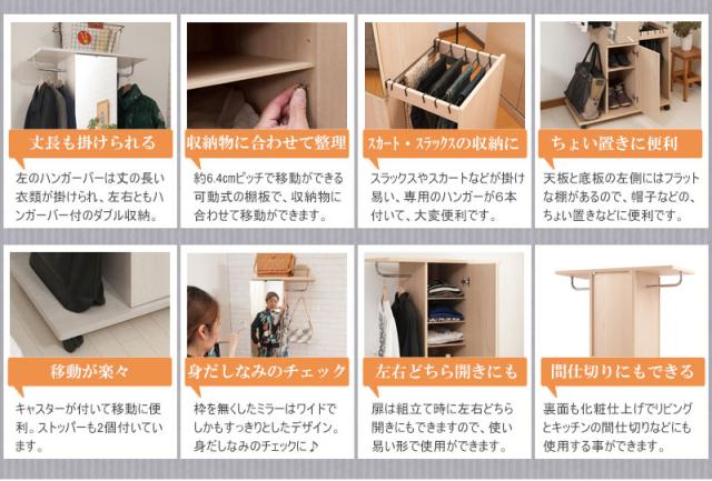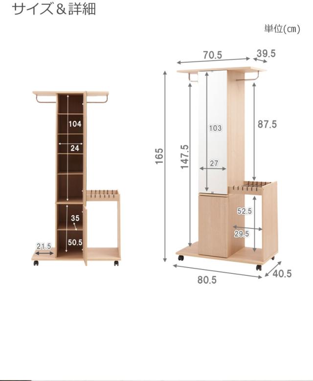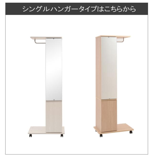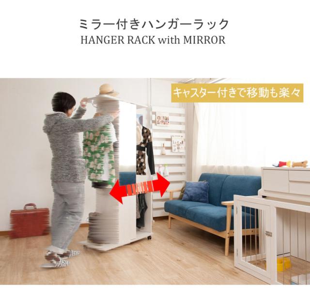 ■商品について/ミラー付きで収納まで完備のハンガーラック。キャスター付きで移動もラクラクな上、衣類も扉付きラックで隠せる収納として、コートなどはハンガーへ、更にスラックスなど掛けられるパンツハンガーまでついた完全無欠のオールインワンラック。全身ミラー付きですっきりとしたデザインはリビングにもOK。一人暮らしなど玄関にシューズボックスとしても◎便利なラックは木目の綺麗なホワイト、ナチュラルの2色から。