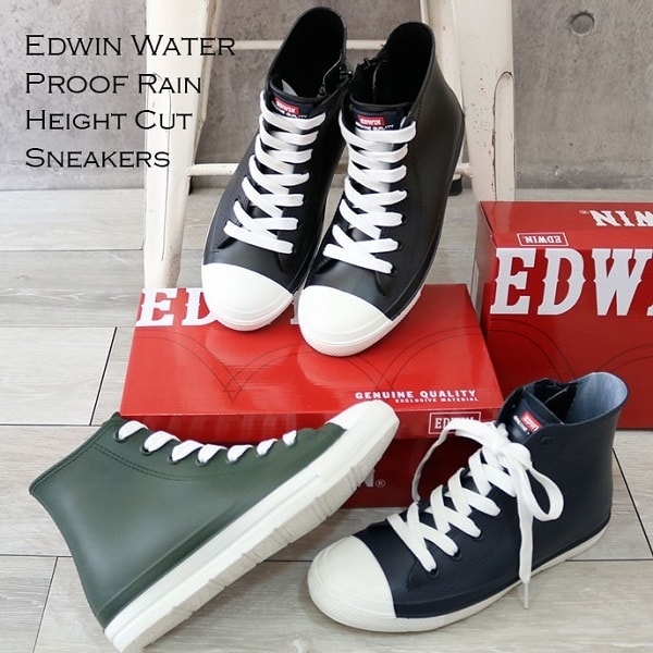 水を通さない防水ゴム素材のEDWIN ハイカットレインスニーカーです。
