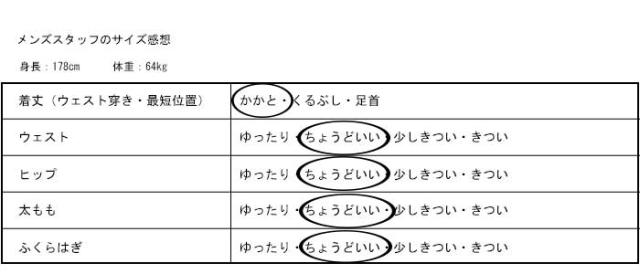 | ウエスト(全ゴム伸縮あり)/Waist | 76〜96/29.92〜37.79 |
