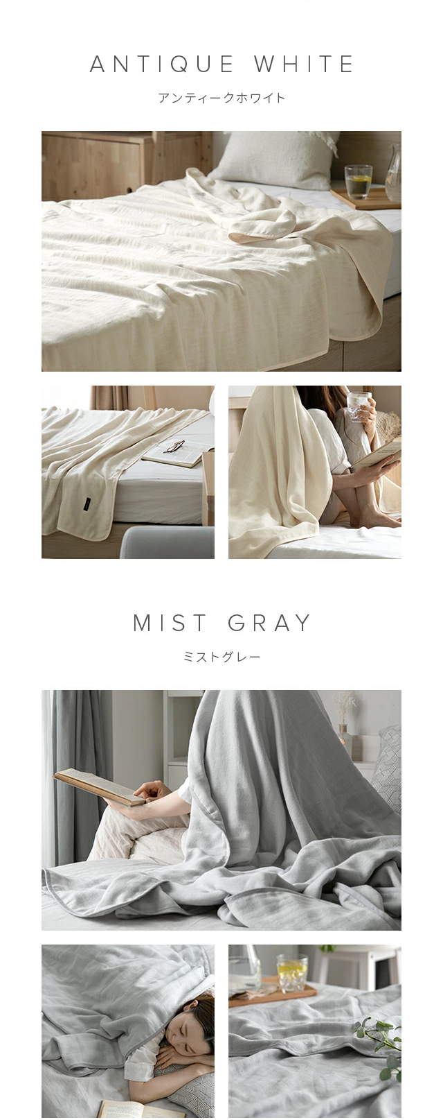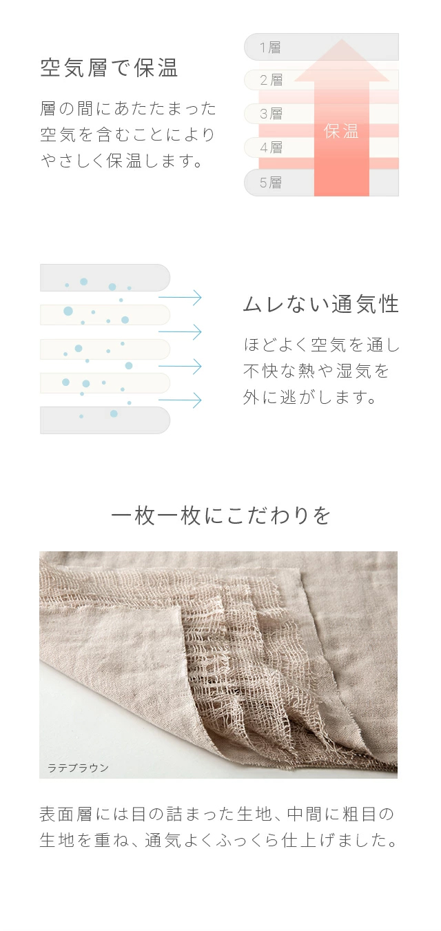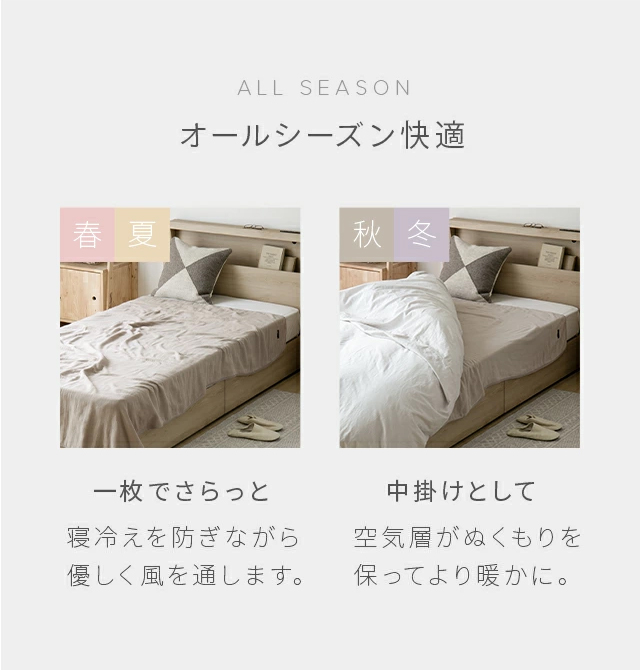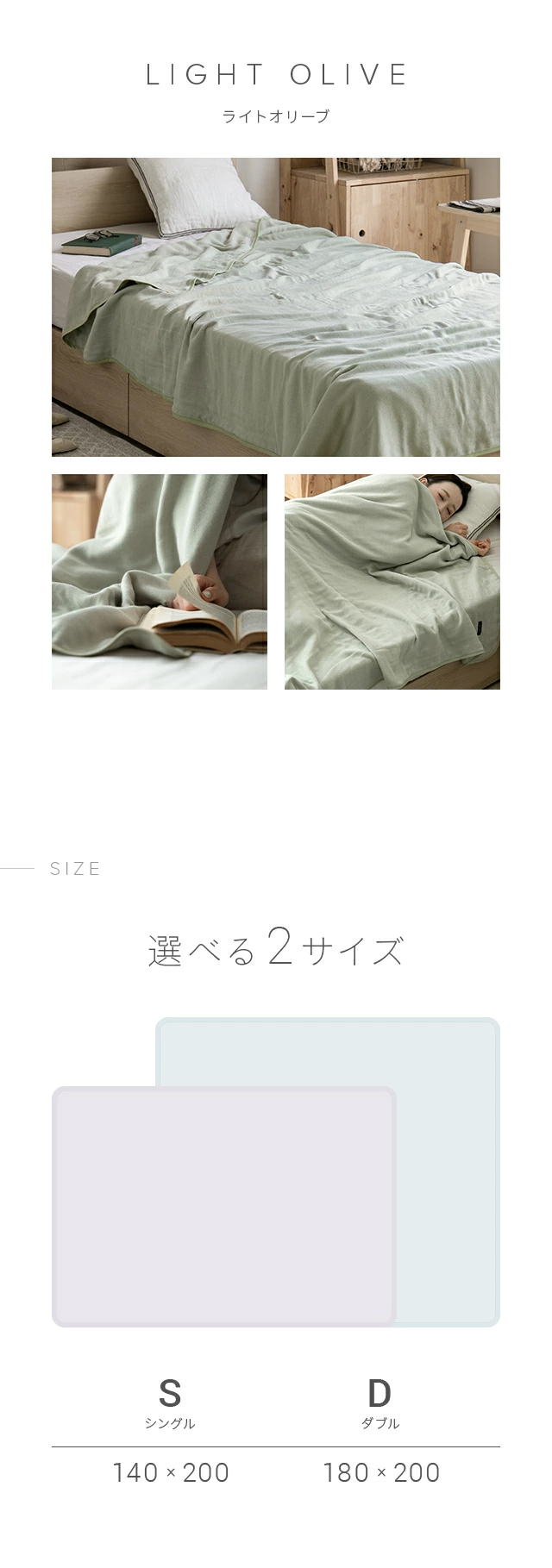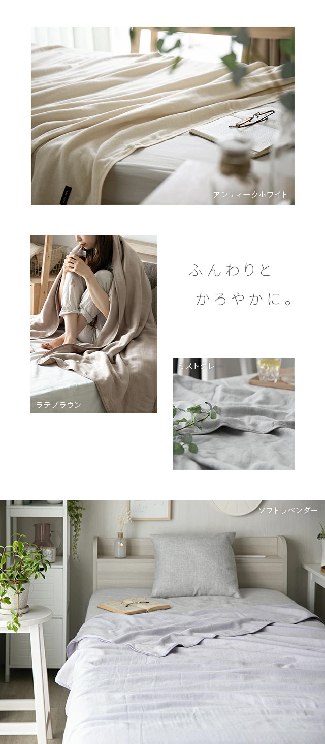 - 寝るときにかるく使えるものを探してました こちらの商品は一年中つかえると言うことでとても助かります 暑い夏にはちょっとだけ厚いかも? けどガーゼタイプなので洗濯してもすぐ乾きそうなので衛生面には最適で...