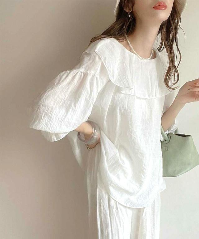 ふんわりしたボリューム袖がさりげないアクセントで女性らしさをUP。