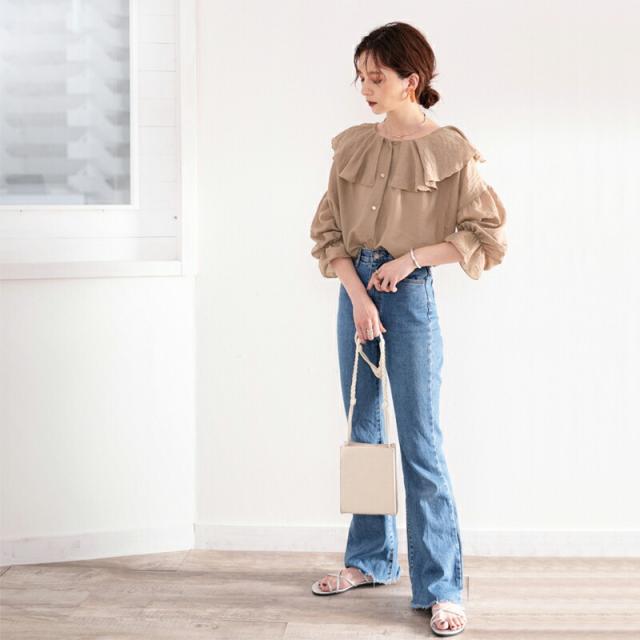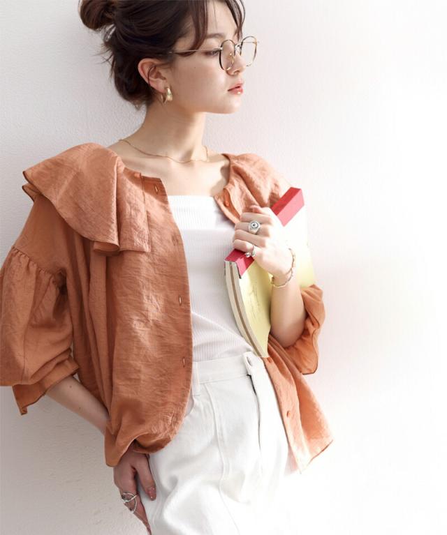 大きな襟が顔周りを華やかに見せてくれ、トレンド感たっぷり。
