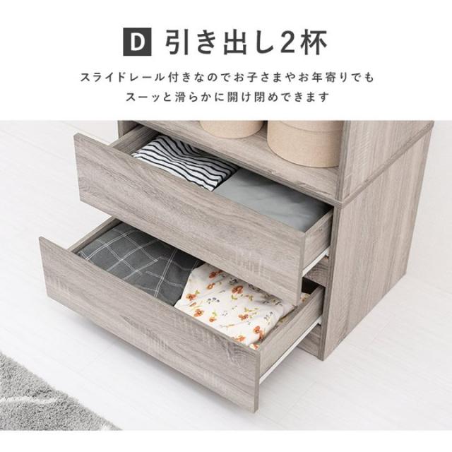 ●天板、ハンガーポール、可動棚、引き出し2杯、多彩な収納力