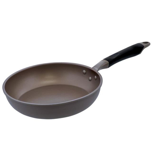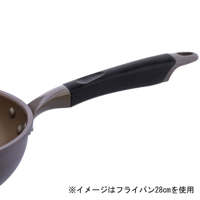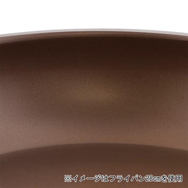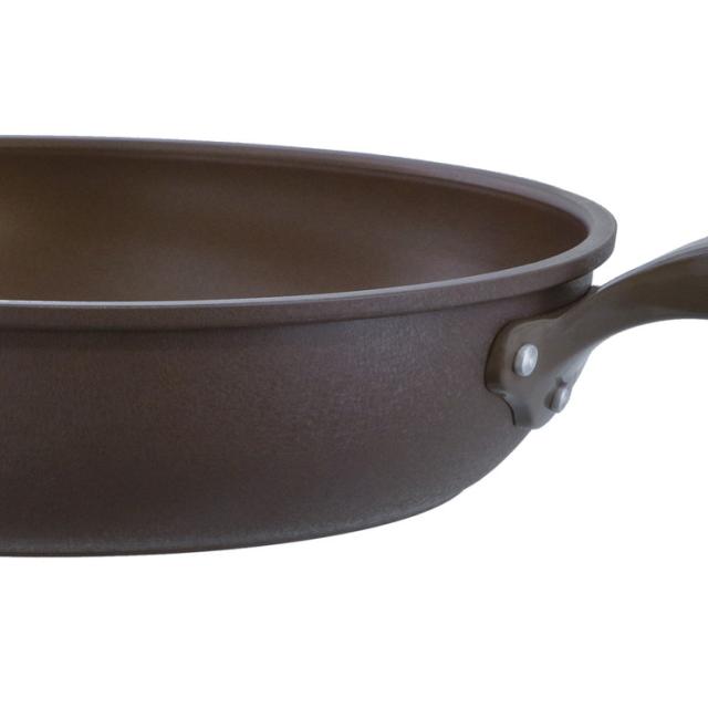 本体/アルミニウム合金 オリジナル縁巻き深型形状、(エッグパンは除く)、内面/ダイキンEKダイヤモンドコートブラウンカラー(耐摩耗性試験30万回)、外面/耐熱焼付塗装、底面/ステンレス(SUS430) 0.4mm圧着、ハンドル/フェノール樹脂