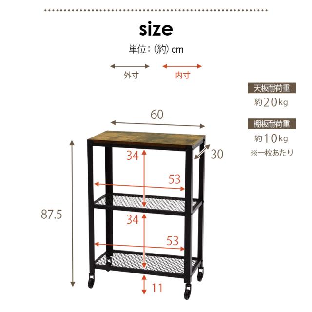 商品名 ラック KR-3765 メーカー 萩原 カラー ブラウン 素材 (約)幅60×奥行30×高さ87.5cm 仕様 ■組立式■キャスター付■天板:約幅60×奥行30cm■固定棚:約幅60×奥行30cm■棚間隔:約34cm