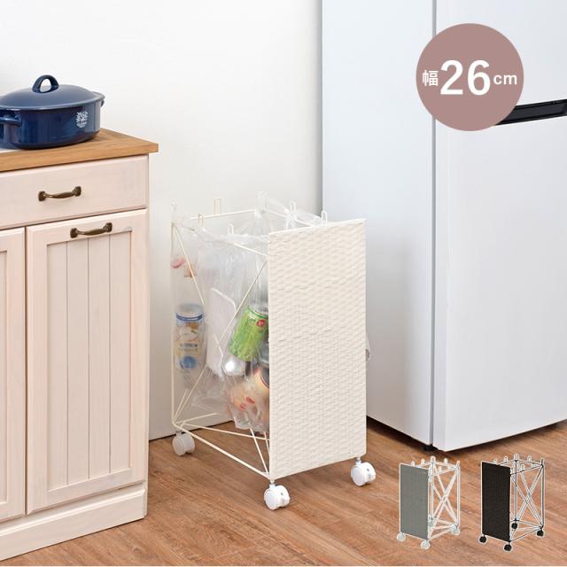 ビニール袋をかけて分別が可能なダストワゴン。1面に樹脂を編み込んでおり目隠しになっています。