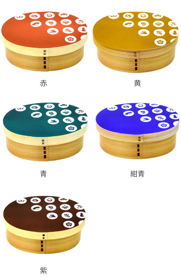 杉材本来の色を貴重としたウレタン塗装に九谷焼で使用する九谷五彩の5色の色鮮やかな塗りが施されたお弁当箱です。柄は縁起のいい物を並べたかわいい和柄模様になっています。木製の曲げわっぱと和柄の組み合わせでより食材が映え、他のお弁当箱とは違う特別感を味わえます。