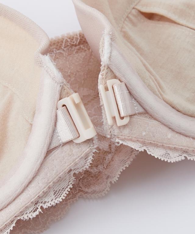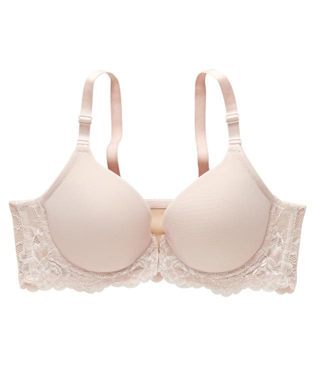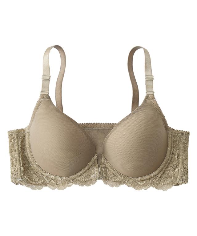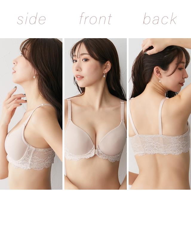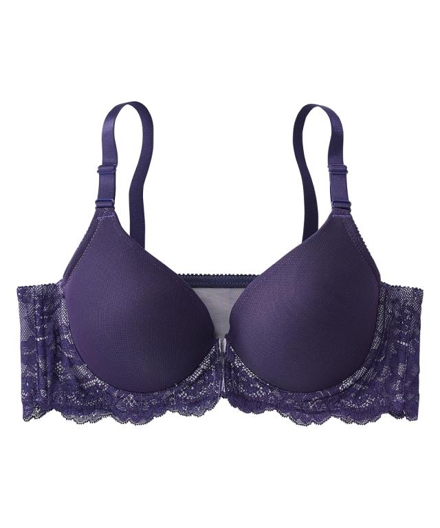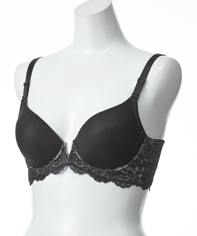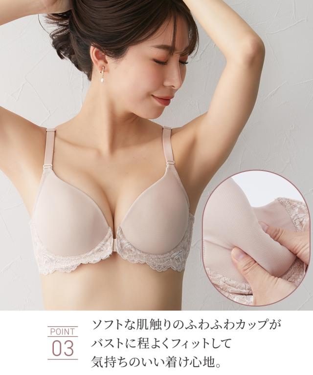 夏の薄手アウターもおまかせ!アウターにひびきにくいモールドカップブラ。柔らか素材なのでバストに肌あたりよくフィット。着脱ラクなフロントホックで、前ストラップで長さ調節できるから手軽にバスト位置を合わせられます。幅広なアンダーベルトがお肉をおさえ、脇と背中もすっきり。レース仕様で見た目もキレイ。