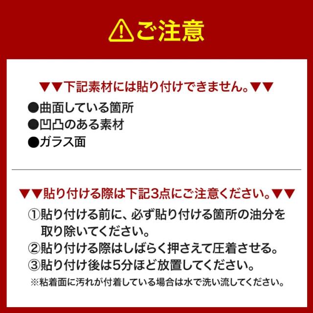 ※本製品は曲面している箇所、凹凸のある素材、ガラス面には貼り付けできません。あらかじめご了承ください。