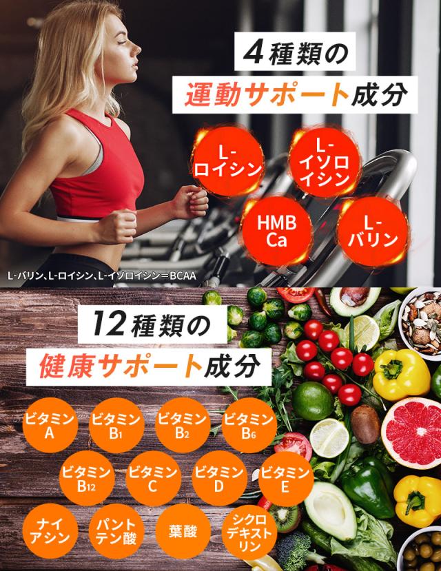 【全24種類のサポート成分】エナジーサポート成分として、L-カルニチン、α‐リポ酸、コエンザイムQ10、ヒハツエキス、L-リジン、ブラックジンジャー、カプサイシン、CLA(共役リノール酸)、運動サポート成分としてHMBカルシウム、BCAA(バリン、ロイシン、イソロイシン)、健康サポート成分として11種のマルチビタミンとシクロデキストリンの全24種類を1粒に贅沢配合しております。