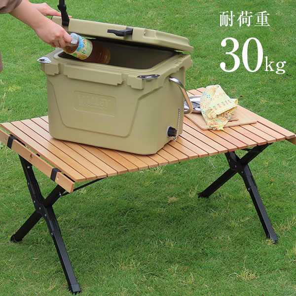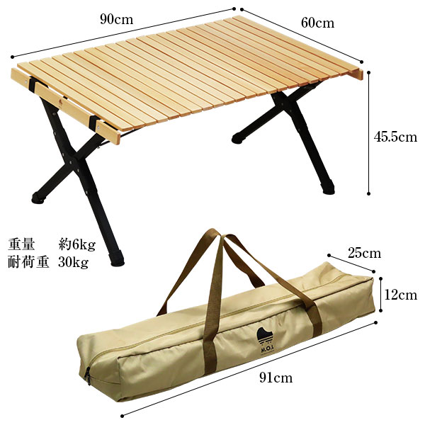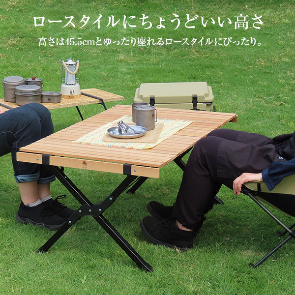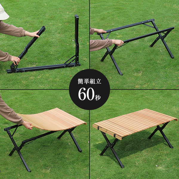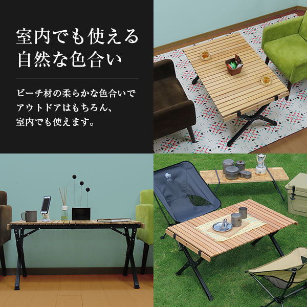 天板は丈夫なビーチ材で自然な風合い。ロール式天板と折り畳み式フレームでコンパクトに収納可能。持ち運びにも便利な収納バック付き。
