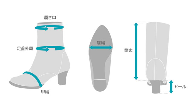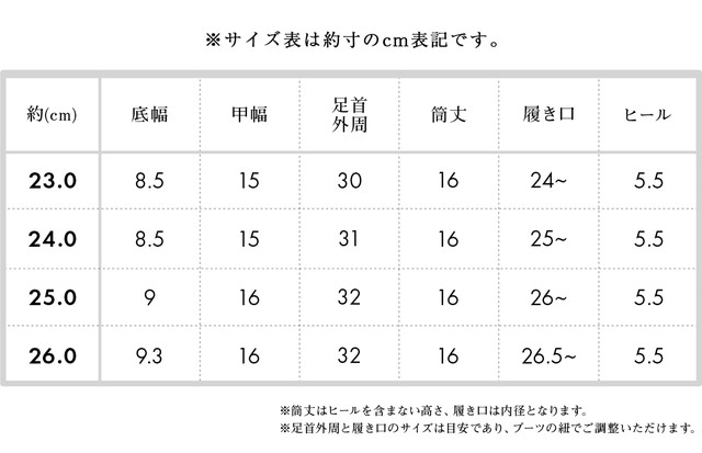※サイズ表は約寸のcm表記、筒丈はヒールを含まない高さとなります。