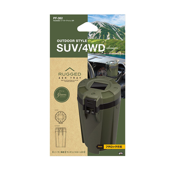ヤック/YAC RUGGED ソーラーアッシュ モスグリーン 灰皿 車内 タバコの吸い殻 電子タバコ SUV/4WDテイスト ソーラー PF-362