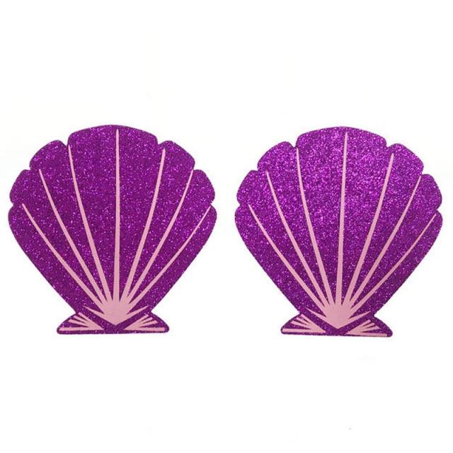 マーメードシェルニップルステッカー/1ペア販売 乳首 シール 胸 おっぱい 貼るだけ 下着 ブラ ランジェリーアクセサリー メンズ レディース ダンサー 女子 バストトップ 大人 セクシー 紫 パープル 可愛い ラメ キラキラ おもしろい コスプレ 隠す 仮装 舞台 貝 人魚