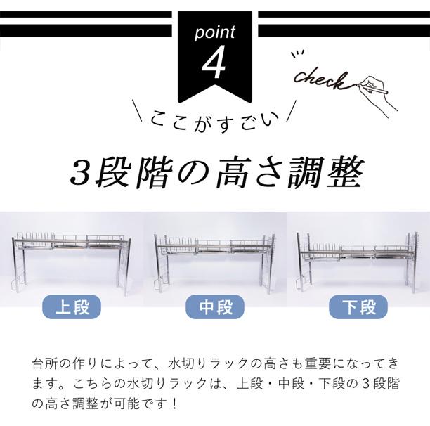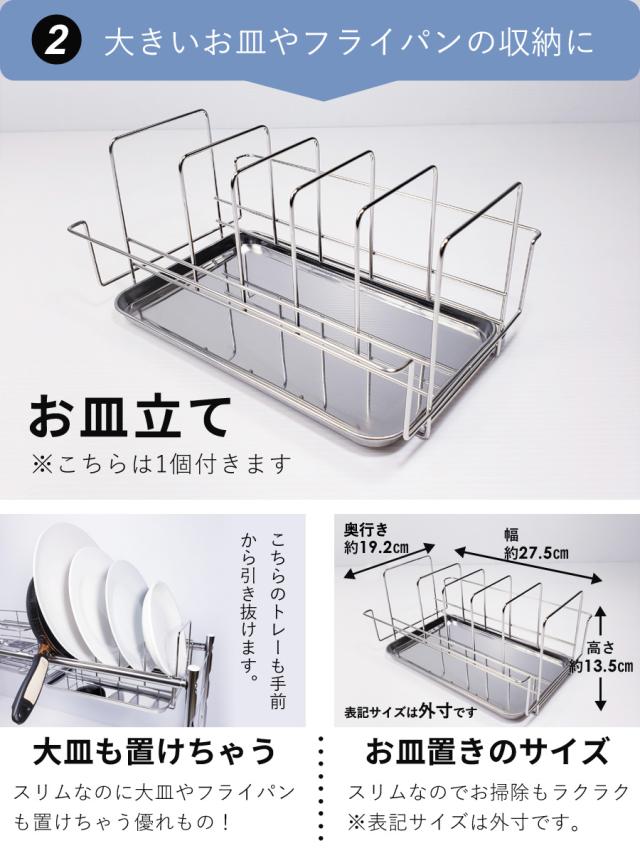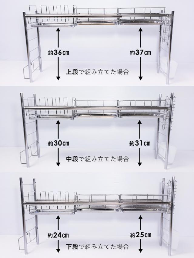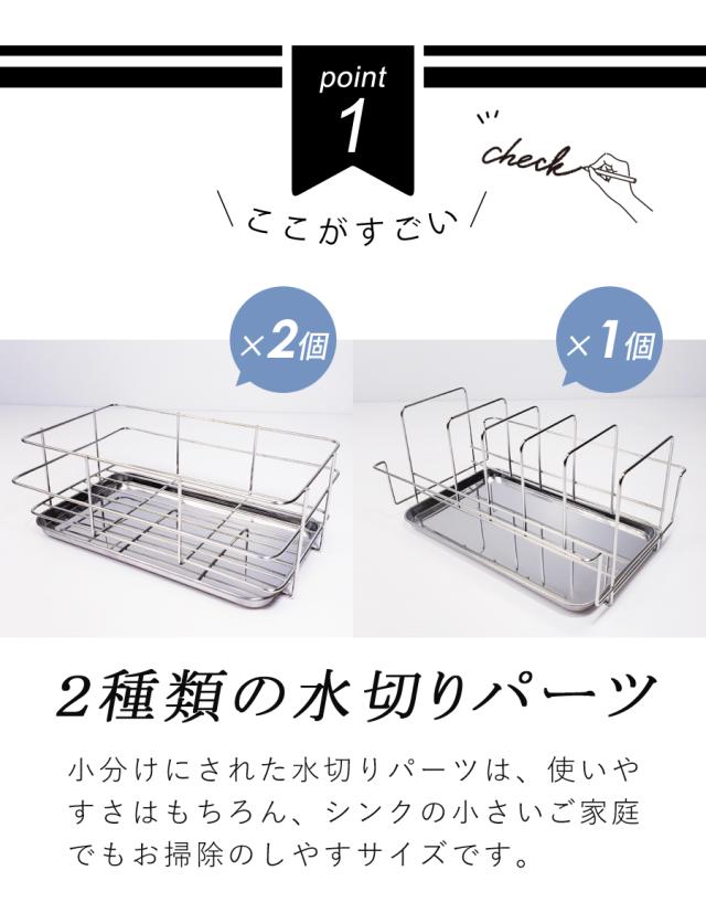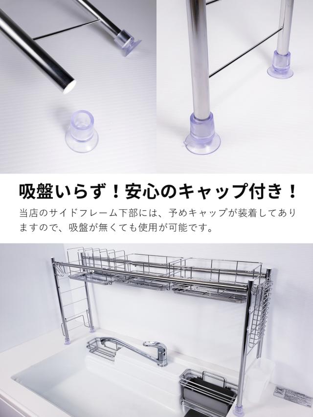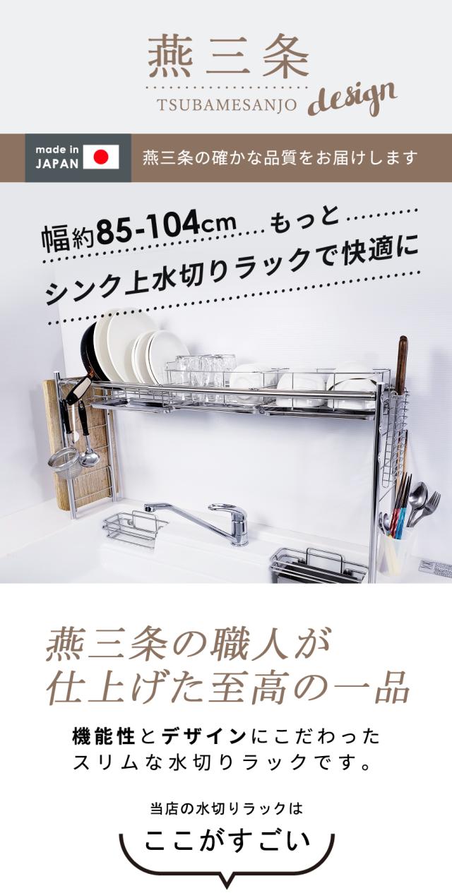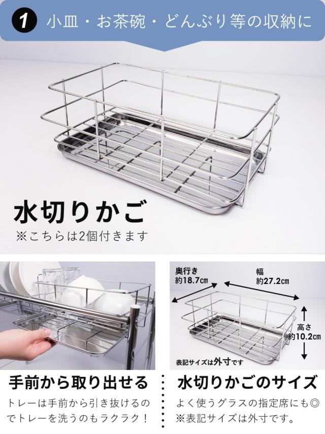 ■生産国:日本 燕三条 ■付属品:水切りかご×2 皿立て×1 トレー×3 まな板立て×1 包丁立て×1 箸立て×1 S字フック×3 脚用吸盤×4