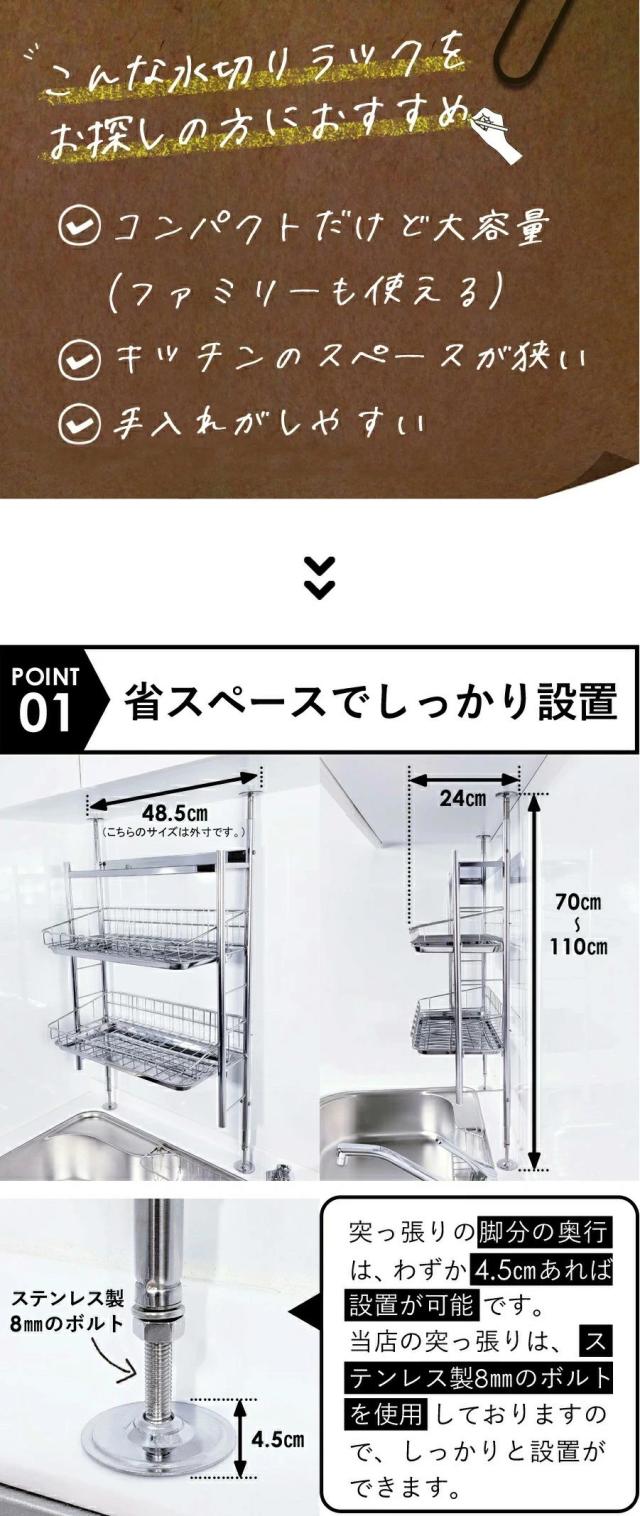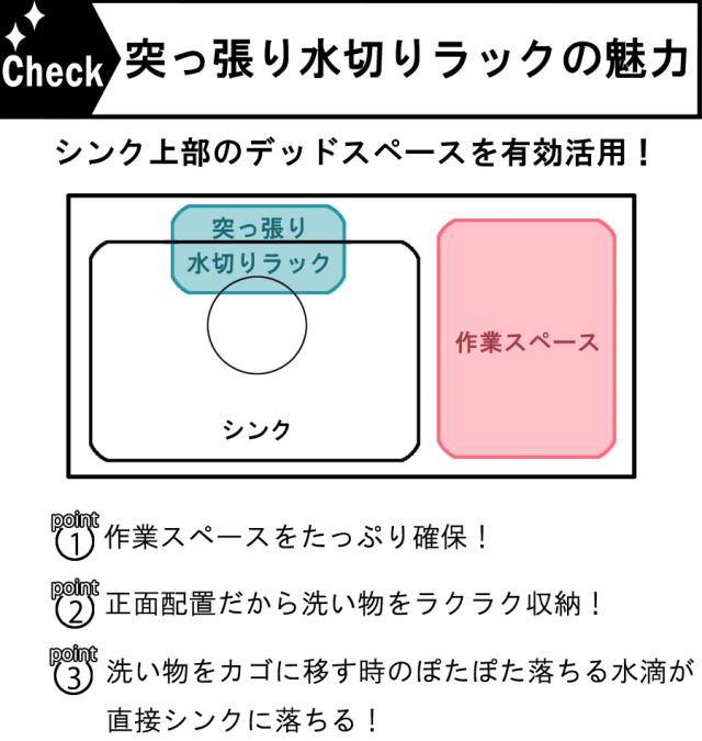 - 水切りラックって、キッチンのどこに置いても結構場所取る存在ですが、ラックを浮かせる突っ張り式のこの商品にしたら、キッチンの作業スペースも広くなりました。 奥行きサイズもコンパクトサイズで良いです。 ...