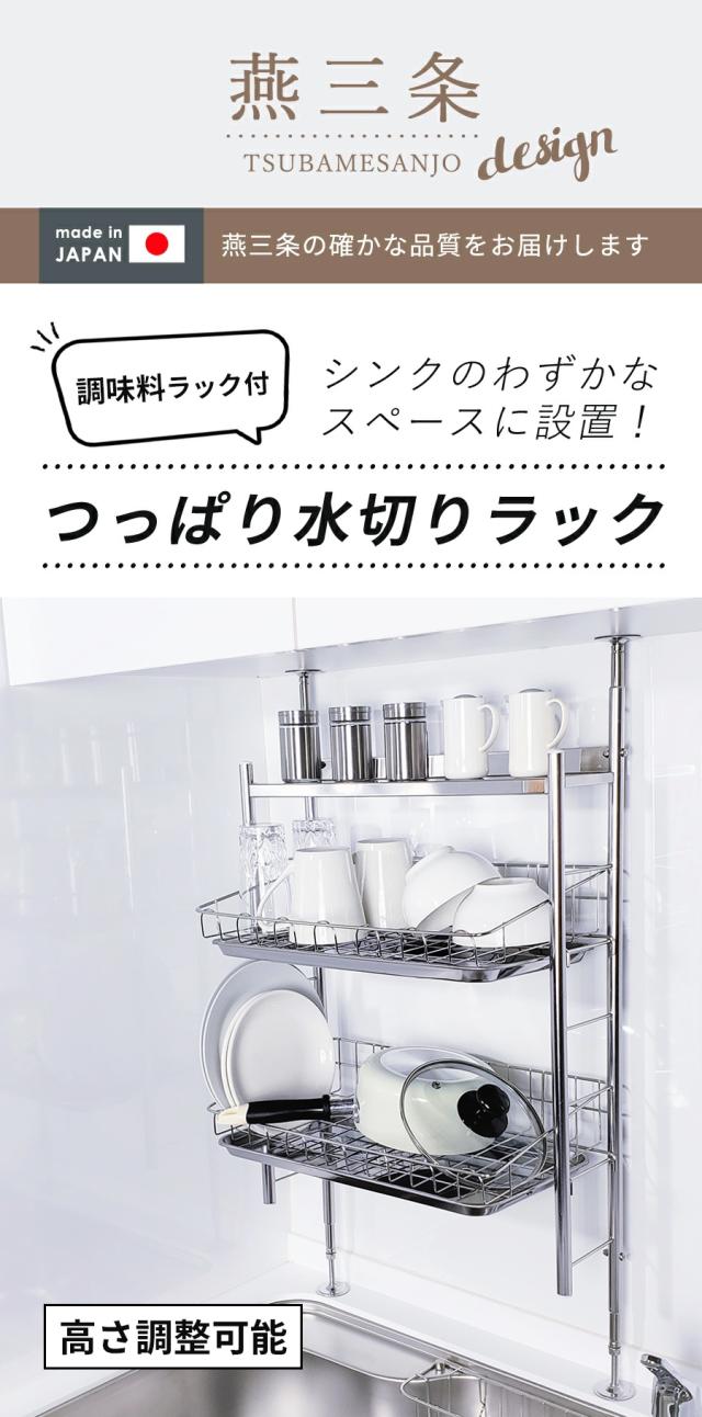 シンクのわずかなスペースに設置することができ、限られたスペースを有効に活用できる 金属加工の聖地『燕三条』の職人が丁寧に作り上げたステンレス製のつっぱり水切りラックです。