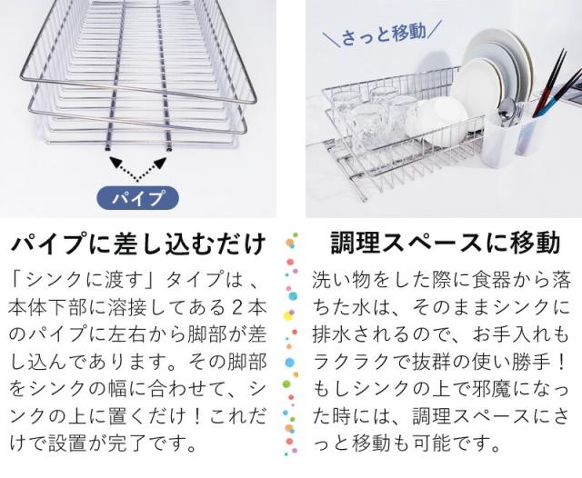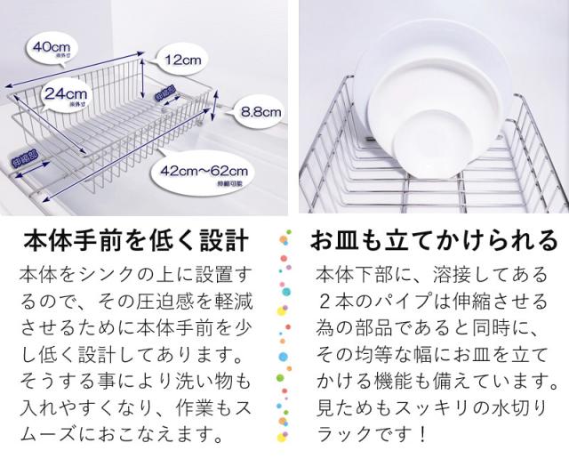 伸縮式による設置場所を選ばない汎用性、 食器から落ちた水がシンクに直接排水される高い利便性と、 18-8ステンレスによる優れた耐久性を実現しました。
