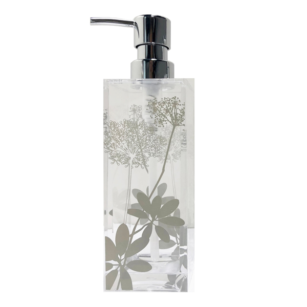 心奪われるプランツ柄が美しいシャンプーボトルです。光沢のあるツヤ感にガラスのような透明感が魅力のアクリル製は、丈夫で割れにくく安心してお使いいただけます。