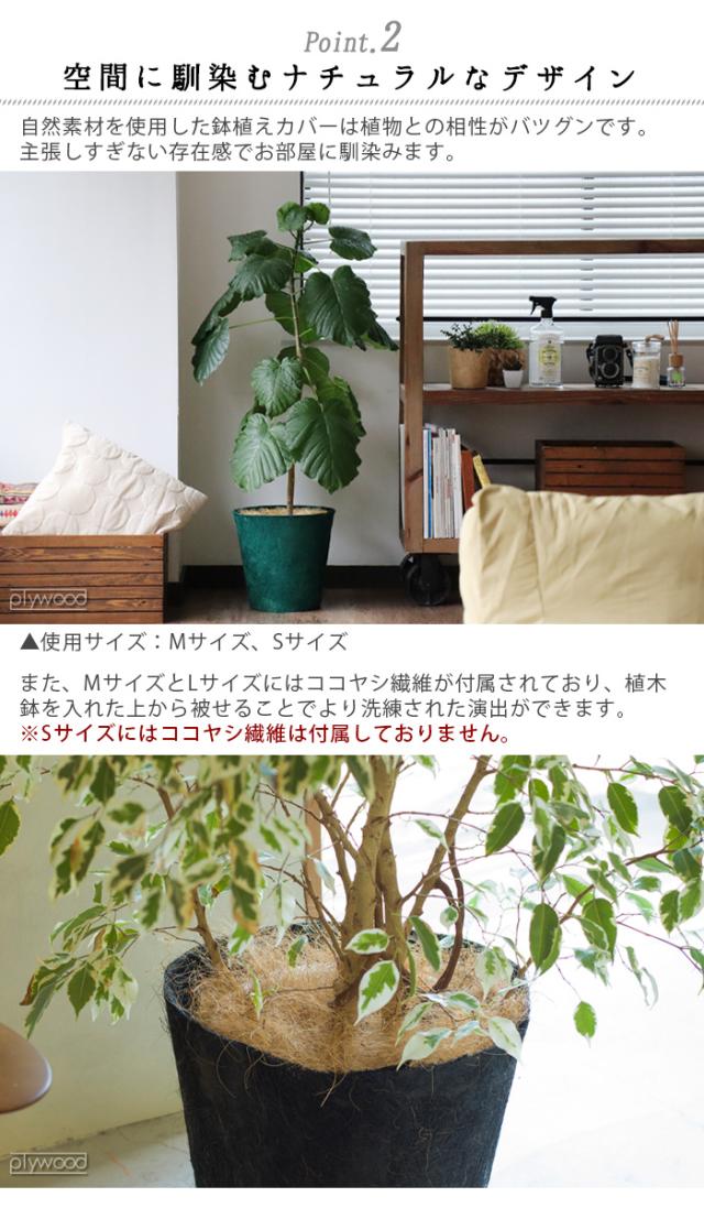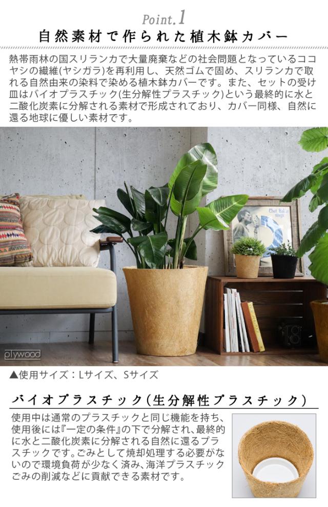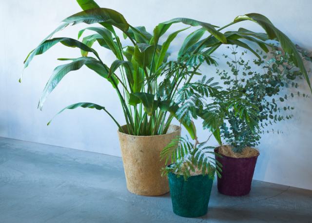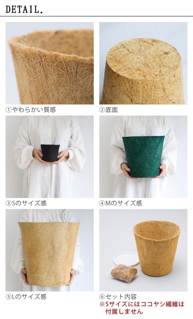 ココヤシの繊維(ヤシガラ)を原料に天然ゴムで固め、天然染料で染色した植木鉢カバーとバイオプラスチックで成形した受け皿のセットです。カバーと受け皿は最終的に自然に還る地球に優しい素材です。サイズは3〜3.5号用のSサイズ、6〜8号用のMサイズ、9〜10号用のLサイズの3サイズです。MサイズとLサイズにはココヤシ繊維が付属されており、植木鉢を入れた上から被せることでより洗練された演出ができます。