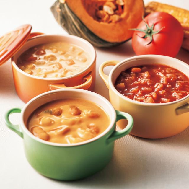 【数量・内容】かぼちゃのチャウダー160g×3、コーンのチャウダ160g×3、トマトのチャウダー160g×2