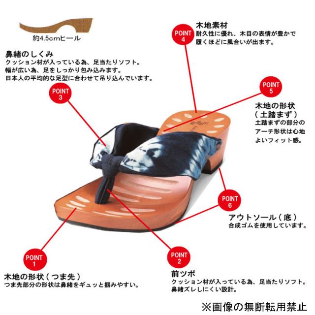足裏にフィットするように施されたオリジナルの彫りと、クッション性のある鼻緒による履き心地の良さを実現した、浴衣や着物はもちろんお洋服にも似合うシンプルなデザイン。日本の伝統的なカタチがモダンな雰囲気を演出。