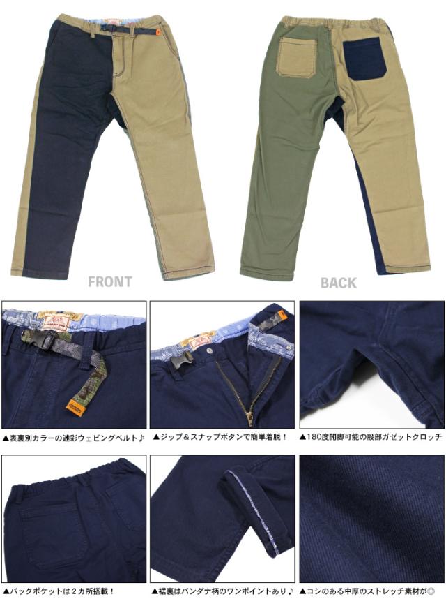 ウエストやポケット裏地、裾裏のテープにバンダナ柄を起用し、細部までこだわった1本。