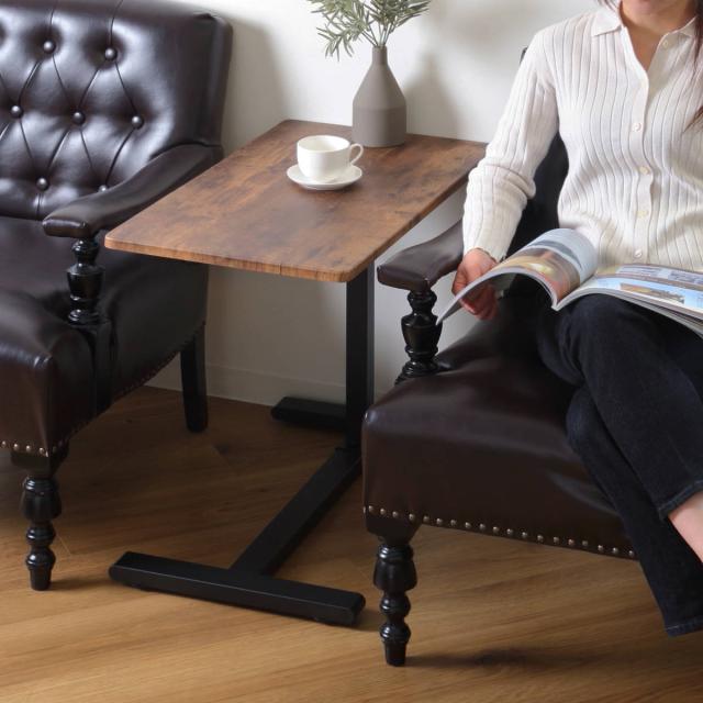 深い色味の木目調天板とブラックスチールの組み合わせがおしゃれなヴィンテージ風のデザインです。シックなウッド調天板と細めの脚がお部屋の印象を引き締め、カフェのような落ち着いた空間を演出します。