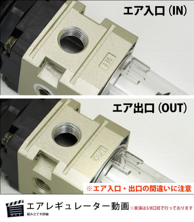 エアフィルタとレギュレータを一体化し、コンパクトにまとめました ●工具の寿命を短くする原因であるコンプレッサー、配管からの水分や不純物を エアーと分離して排出します ●圧力調整ダイヤルを回す事でエアー圧力を調整(減圧)して用途に合った使い方が できます ●1/4口径 ※エアー「IN」「OUT」の接続間違いは、エアー漏れや設定圧不良の原因となります ※一部イメージ画像に3/8口径の製品を使用しております サイズ・仕様等をご確認の上、ご注文をお願いいたします |