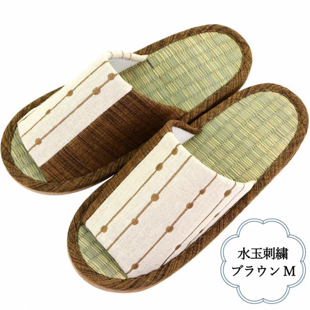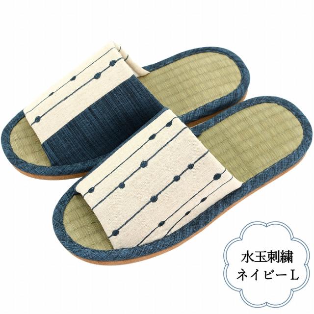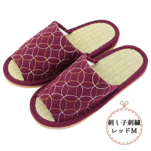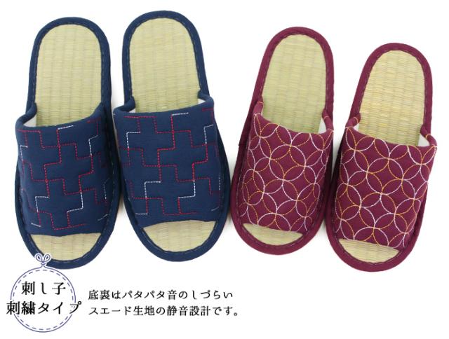 【おしゃれで通気性が良い】昔ながらの和柄刺繍としじら織り風デザインのたたみスリッパ。涼し気な見た目で、中敷きが畳仕様のスリッパは、いつでもさらっと快適な、い草のソールで汗ばむ季節にもぴったり。一年を通して快適に着用できます。