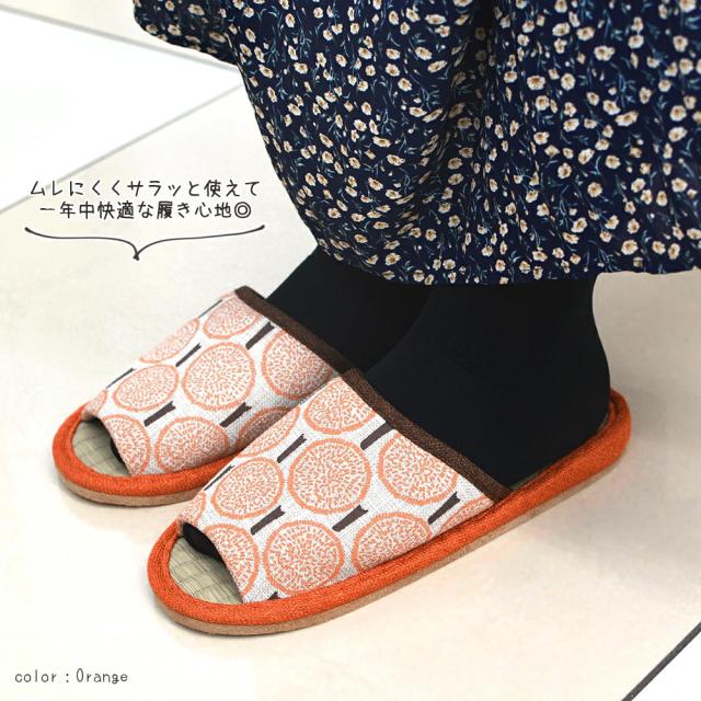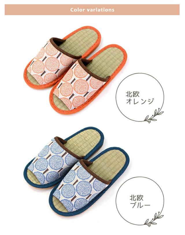 【さらっと快適!畳スリッパ】天然素材の「い草」の表面がサラッとしていて気持ち良く、足裏に熱がたまらず一年中さらっと快適です。自然の素材を活かした畳スリッパは、素足で履いてもムレにくく、快適な履き心地です。春夏には特におすすめのアイテムですが、「い草」は保温性と吸音性と温度調節機能をもっていると言われていますので、機密性の高い現代住宅では、年間通して使用できるスリッパとなっています。