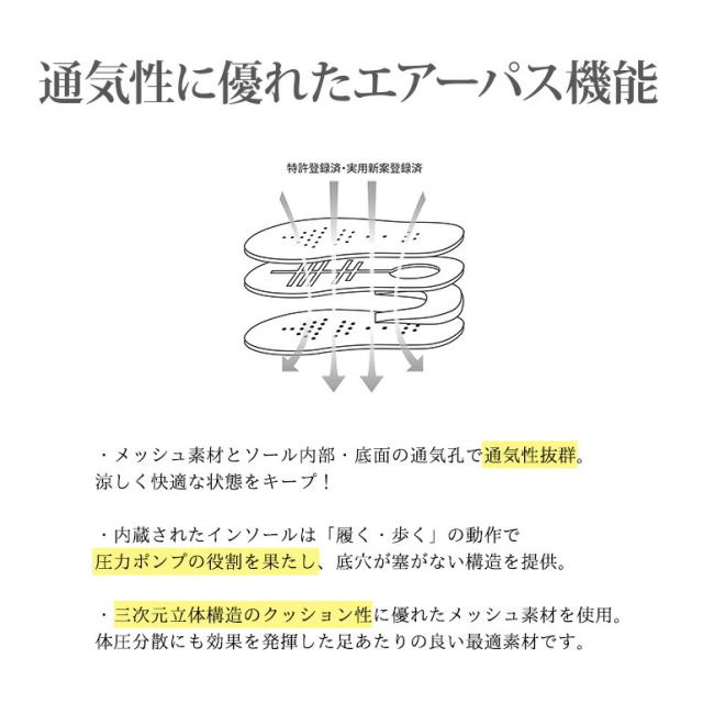 内蔵されたインソールは「履く・歩く」の動作で圧力ポンプの役割を果たし、