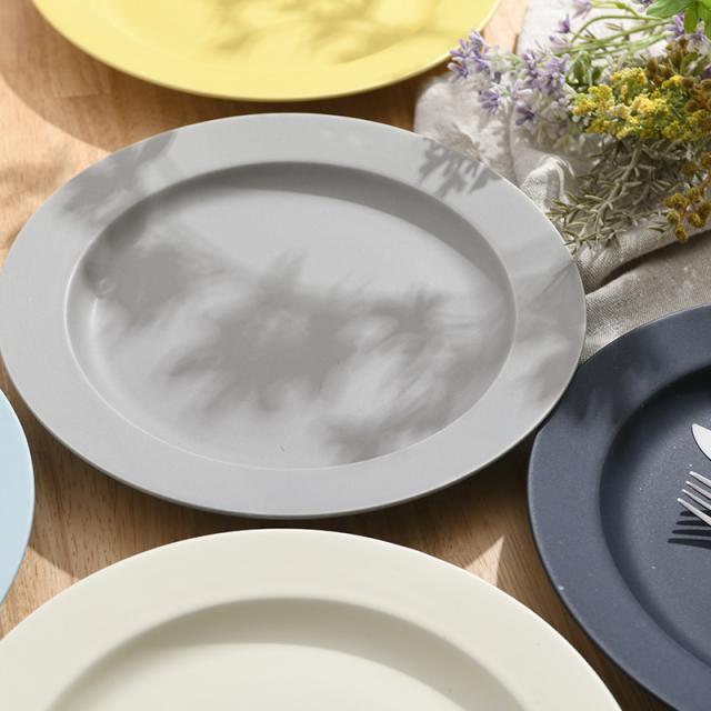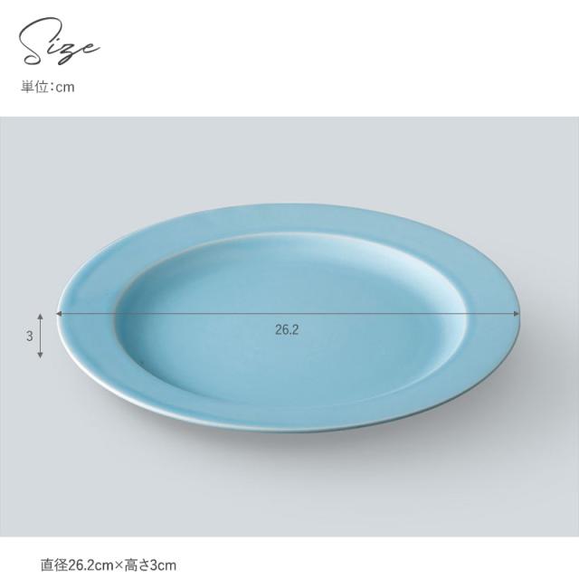 幅広のリム以外に装飾性のない洗練されたデザイン。マットな釉薬で仕上げた落ち着きのある色合いで、和食、洋食、メインディッシュ、スイーツなど、幅広いジャンルのお料理にコーディネートできます。リムを除くと直径19cmほどになり、メイン料理、ワンプレートメニュー、カレー皿などにちょうどいいサイズ感です。