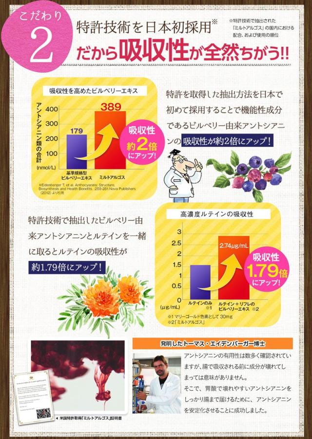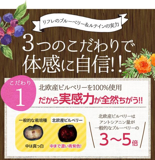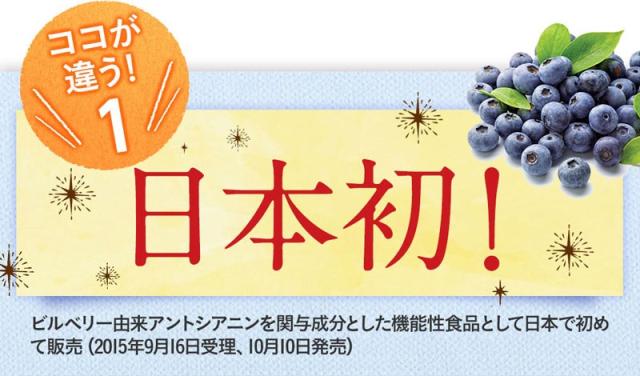 | 機能性関与 成分名 | ビルベリー由来アントシアニン 40mg、ルテイン 6mg ※ビルベリー由来アントシアニンはビルベリーエキス末120mgに含まれます。 |