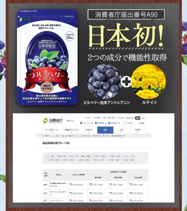 | 届出表示 | 本品には、ビルベリー由来アントシアニン及びルテインが含まれます。ビルベリー由来アントシアニンには眼の疲労感を改善する機能、ルテインには網膜の黄斑色素を増やすことで目の黄斑部の健康を守る機能が報告されています。 本品は、事業者の責任において特定の保健の目的が期待できる旨を表示するものとして、消費者庁長官に届出されたものです。ただし、特定保健用食品と異なり、消費者庁長官による個別審査を受けたものではありません。 |