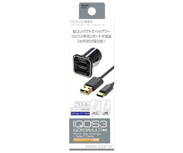 アークス コンパクトチャージャー IQOS3/マルチ 電子タバコ アイコス充電器 USB2ポート DC12/24V Type-C スマホ充電も可能 QA-33