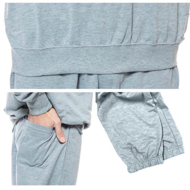 薄手のさらっとした素材、定番スタイルの丸首トレーナーと裾ゴムのパンツ