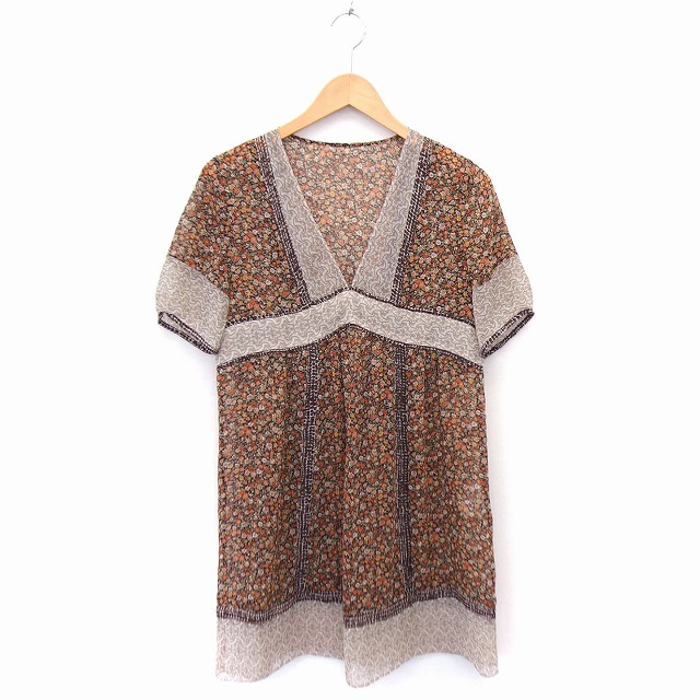 【中古】カーライフ carlife ワンピース 小花柄 透け感 Vネック 半袖 ひざ丈 ブラウン 茶 /FT8 レディース
