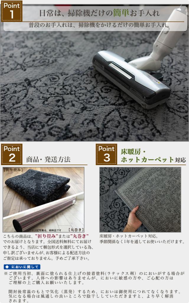 | 【こちらの商品の梱包方法】 ・「折り畳み」もしくは「丸巻き」:お客様によるご指定はいただけません。 ※商品は開梱時、ラグマット、カーペットの毛並みにムラなどがございますが、使用するにつれ、なくなります。 ※商品によりサイズに多少の誤差があります。 ※こちらの商品は、ご使用当初、裏面に塗られる仕上げの接着塗料の匂いがする場合がございます。常温のもとで気化(蒸発)するため、匂いはご使用につれてなくなります。 ※カラーはディスプレイ上、実際の色と多少異なる場合がございます。 ※こちらの商品は気になる遊び毛などは出にくいつくりとなっております。 ※滑りやすい場所でのご使用は市販のカーペット用の滑り止めネットのご使用をお勧めします。 ※汚れた場合は、カーペットクリーナー、中性洗剤などを薄め固く絞ったタオルなどで拭き取ってください。 | |