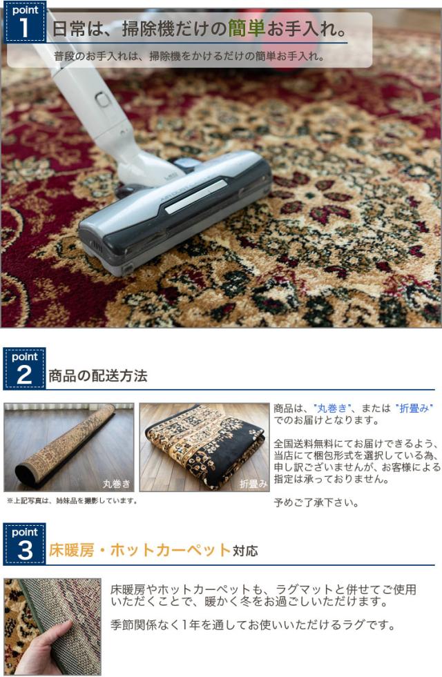 | 【こちらの商品の梱包方法】 ・「丸巻き」もしくは「折り畳み」:お客様によるご指定はいただけません。 ※商品は開梱時、ラグマット、カーペットの毛並みにムラなどがございますが、使用するにつれ、なくなります。 ※商品によりサイズに多少の誤差があります。 ※こちらの商品は、ご使用当初、裏面に塗られる仕上げの接着塗料の匂いがする場合がございます。常温のもとで気化(蒸発)するため、匂いはご使用につれてなくなります。 ※カラーはディスプレイ上、実際の色と多少異なる場合がございます。 ※こちらの商品は気になる遊び毛などは出にくいつくりとなっております。 ※滑りやすい場所でのご使用は市販のカーペット用の滑り止めネットのご使用をお勧めします。 ※汚れた場合は、カーペットクリーナー、中性洗剤などを薄め固く絞ったタオルなどで拭き取ってください。 | |