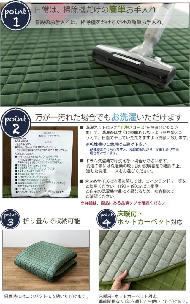 | 【こちらの商品の梱包方法】 ・折り畳み ※商品は開梱時、ラグマット、カーペットの毛並みにムラなどがございますが、使用するにつれ、なくなります。 ※商品によりサイズに多少の誤差があります。 ※カラーはディスプレイ上、実際の色と多少異なる場合がございます。 ※こちらの商品は気になる遊び毛などは出にくいつくりとなっております。 ※滑りやすい場所でのご使用は市販のカーペット用の滑り止めネットのご使用をお勧めします。 ※汚れた場合は、カーペットクリーナー、中性洗剤などを薄め固く絞ったタオルなどで拭き取ってください。 | |