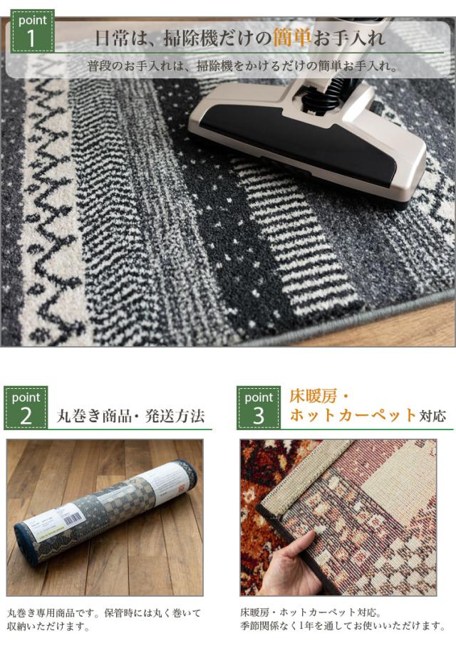 【こちらの商品の梱包方法】 ・丸巻き ※商品は開梱時、ラグマット、カーペットの毛並みにムラなどがございますが、使用するにつれ、なくなります。 ※商品によりサイズに多少の誤差があります。 ※カラーはディスプレイ上、実際の色と多少異なる場合がございます。 ※こちらの商品は気になる遊び毛などは出にくいつくりとなっております。 ※滑りやすい場所でのご使用は市販のカーペット用の滑り止めネットのご使用をお勧めします。 ※汚れた場合は、カーペットクリーナー、中性洗剤などを薄め固く絞ったタオルなどで拭き取ってください。 |