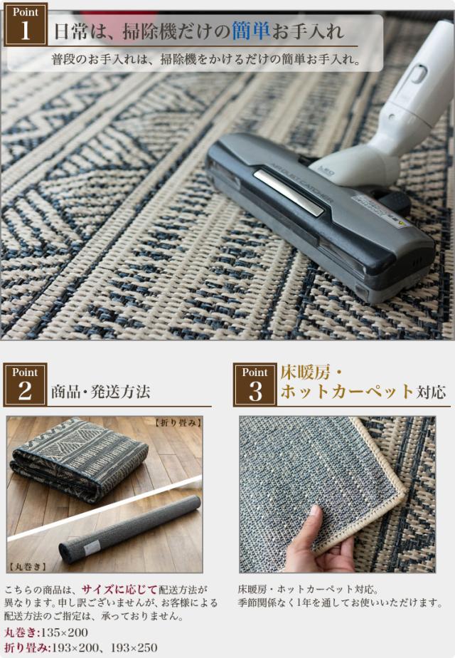 | 【備考】 ※商品によりサイズに多少の誤差があります。 ※カラーはディスプレイ上、実際の色と多少異なる場合がございます。 【こちらの商品の梱包方法】 ・サイズに応じ「折り畳み」「丸巻き」のどちらかで配送いたします。(お客様によるご指定はいただけません) ・開梱時、ラグマット、カーペットの毛並みにムラなどがございますが、使用するにつれ、なくなります ・こちらの商品は気になる遊び毛などは出にくいつくりとなっております ・滑りやすい場所でのご使用は市販のカーペット用の滑り止めネットのご使用をお勧めします ・汚れた場合は、カーペットクリーナー、中性洗剤などを薄め固く絞ったタオルなどで拭き取ってください | |